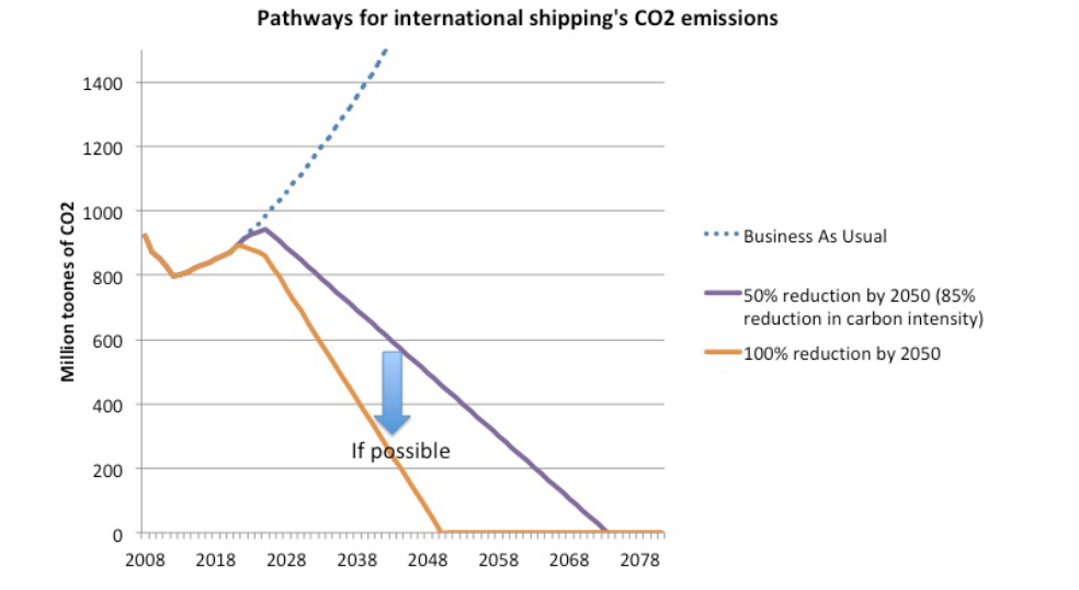 This means at least 50% reduction in GHGs by 2050 from a 2008 baseline. Under a 2oC pathway, 50% means shipping’s share of net CO2 emissions is likely to grow from current 2.3% share to around 10% by mid-century. This is a significant reduction relative to the growth under a business as usual scenario.