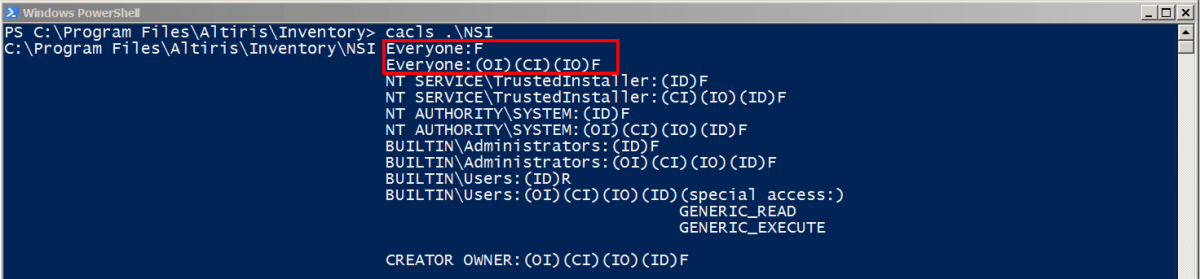 We noticed that folders within the Altiris file structure had the ‘Everyone – Full Control’ permission applied. These folders seemed to contain fairly benign content, such as scan configuration files and XML files, from what we believed to be the inventory scan or output from a recent task. These folder and file permissions were found using a simple PowerShell one liner which allowed us to perform an ACL review on any Windows host, using only the tools on that host. An example of this one liner is as follows: