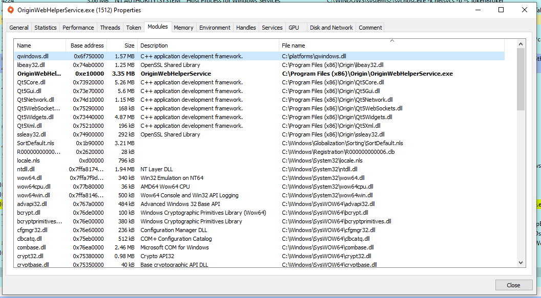 Our next course of action was to have a look at one of the service processes OriginWebHelperService.exe process using another free tool called ProcessHacker [3]. Something immediately stood out to us, which can be seen in the image below;OriginWebHelperService.exe is loading a DLL qwindows.dll from the directory C:\Program Files (x86)\Origin\platforms\.