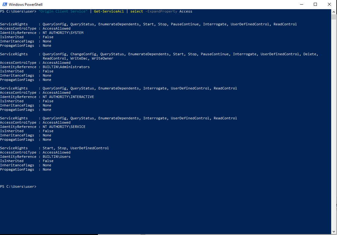 This allowed us to determine that any user is able to start and stop the OriginClientService.exe service process. This is an added bonus; we now don’t have to wait for reboot in order to execute our malicious payload; we can simply start the service and get as many elevated command prompts as we want: