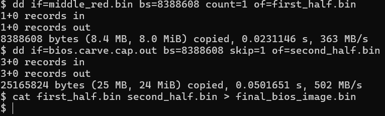 To only update what was in the BIOS region, we can copy the update file from 0x1000000 (16777216) onwards into the flash file at the same location. DD can be used for this by taking the first half of the flash, the second half of the update, and merging them together.