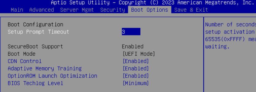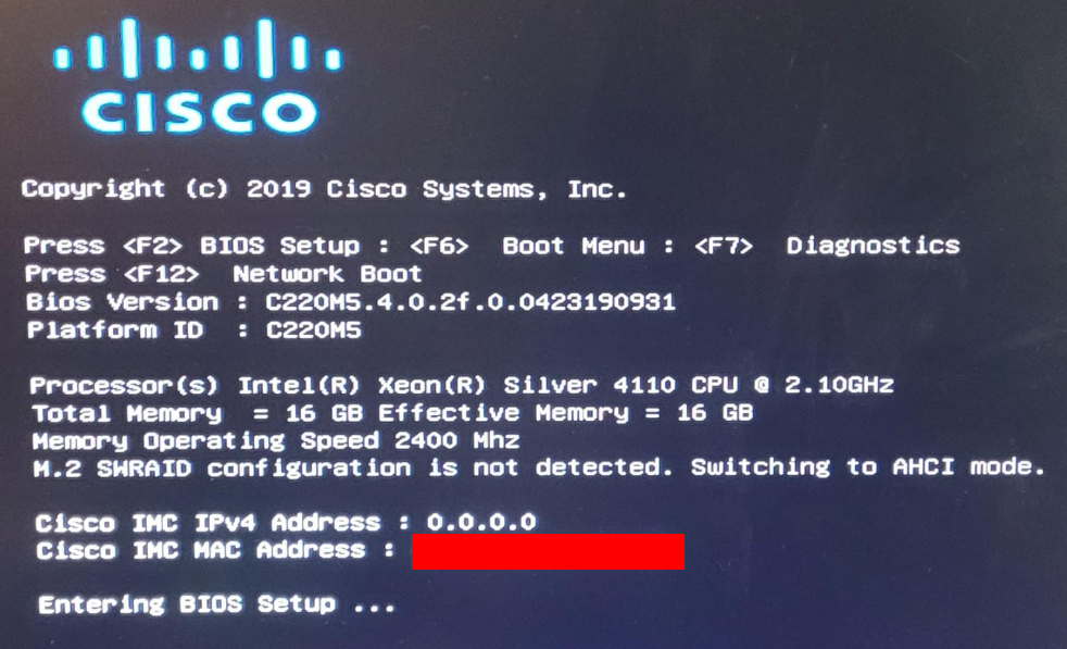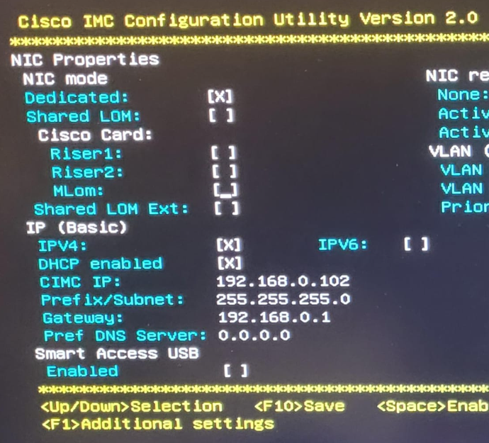 With the BIOS updated to the latest version, a few new features are available. The BIOS screen now presents the option to configure CIMC! Result! Alas, we still cannot make meaningful configuration changes, disable secure boot, or boot our own code.
