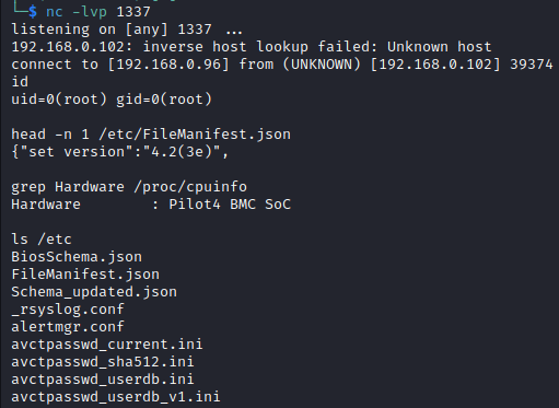 This can be taken a step further to get a full reverse shell from the BMC using the following query string: