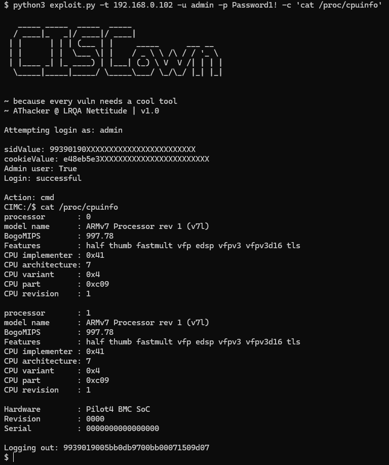 Exploiting the vulnerability with cat /proc/cpuinfo to check the CPU in use: