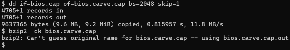 The .cap file contained a header of 2048 bytes with important information about the firmware. This would be read by the built-in tools to update the BIOS, ensuring everything is correct. After removing the header, it needs to be decompressed with bzip2.