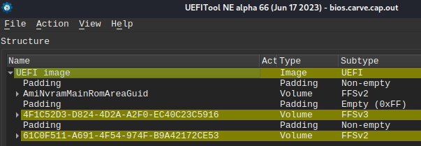 Just to be safe, we can check with UEFITool to make sure nothing went majorly wrong. The screenshot below shows everything looks fine, and the UUIDs for the new volumes in the BIOS region have been updated.