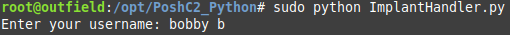 The astute amongst you will have noticed the new User column in the report above. Another improvement that has been made in relation to tracking tasks is user logging. Now when you start the ImplantHandler you are prompted for a username; it is possible to leave this blank if required, but when PoshC2 is being used as a centralised C2Server with multiple users it’s important to track which user ran which task as shown in the examples below: