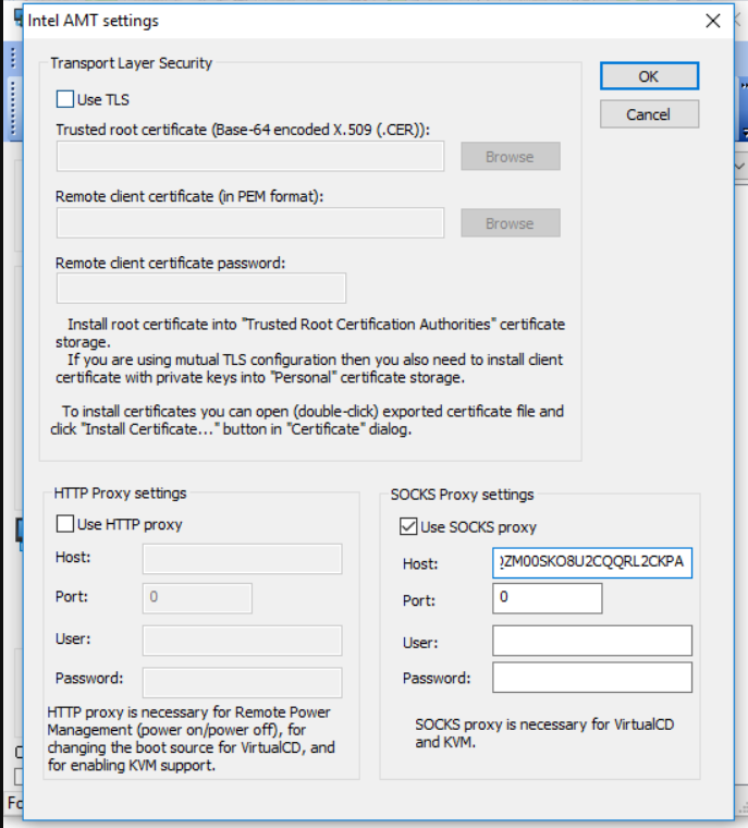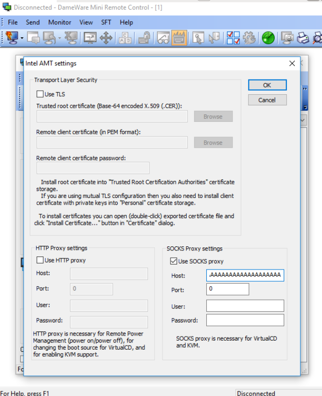 One of the windows (AMT Settings) within in the GUI has several input fields. The majority of these fields lack appropriate input sanitization, leading to crashes when entering a large amount of input (more than 3,000 characters). However, for the proof of concept, only one of these fields was used; the “Host” field under the SOCKS Proxy Settings.