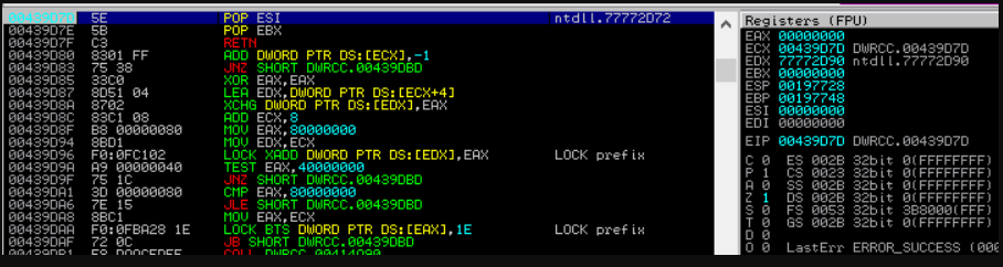 Interestingly though, the A’s aren’t displayed how they were entered and have been separated by null bytes (0x00). This is because the input buffer is processed as wide characters, with UTF-16 encoding. From here, the next step is to determine how many bytes are required before the overwrite happens and to find a suitable set of “POP, POP, RET” instructions. The buffer length before the overflow was identified using Metasploit’s helpful “pattern_create” and “pattern_offset” utilities, taking care to observe the bytes surrounding the overflow as the null bytes have to be discounted. As the DWRCC.EXE (main executable) is not being rebased on each execution, the instruction set found at address “0x00439D7D” was chosen. The executable was compiled without common protections, including ASLR which would have made hardcoding an address in the shellcode infeasible.