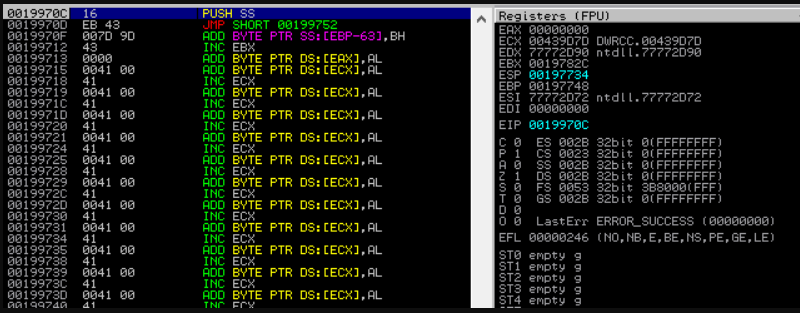 The next step is to overwrite the SEH and next SEH addresses with the address of the instruction found above and the op codes for a small jump over that address. Once executed, the execution flow should be then directed into the area of memory on the stack under our control. For both the address and the jump, UTF-16 characters were used so to avoid the null bytes. The payload looks like this at this point (most of the ‘A’s have been cropped for readability).
