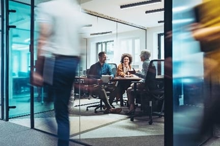 Blurred image of business people walking by window with sky behind