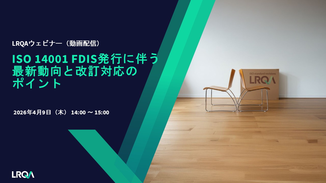 この度、LRQAはISO 14001(環境)のFDIS発行に伴う改訂内容をより多くの方にお届けするため、2月26日に実施したウェビナーの動画を使用したライブウェビナーを4月9日(木)に開催いたします。前回ご参加いただけなかった方からのご要望を受け、ライブ形式で再度取り上げるものです。