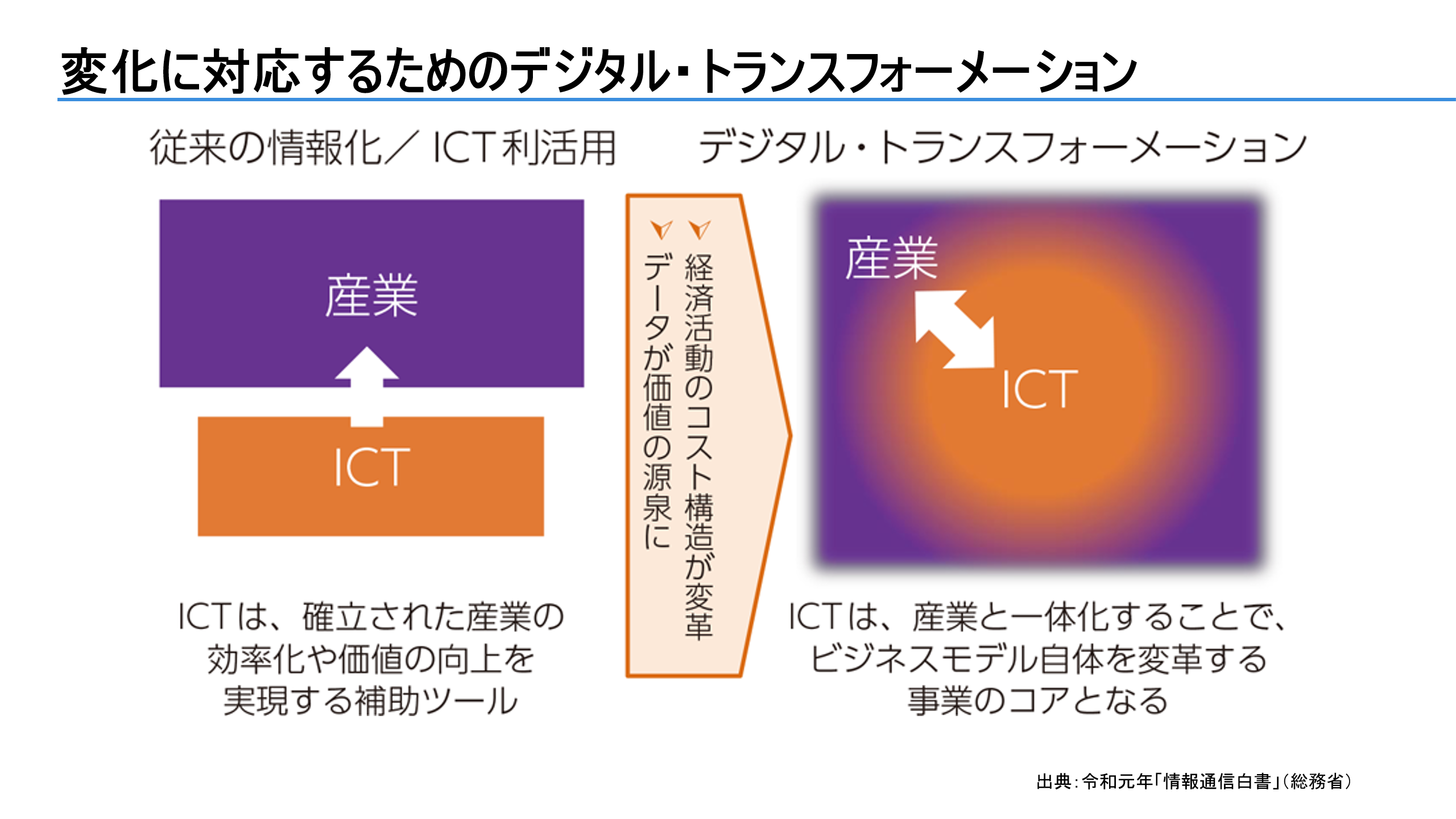 このSDGs達成には、イノベーションとパートナーシップがカギとなるといわれています。政府はSociety 5.0の推進をSDGs達成のための一つの柱として捉えています。そのSociety 5.0を実現するためには、ビジネスにおけるICTの位置付けを大きく転換するデジタル・トランスフォーメーションが必要です。