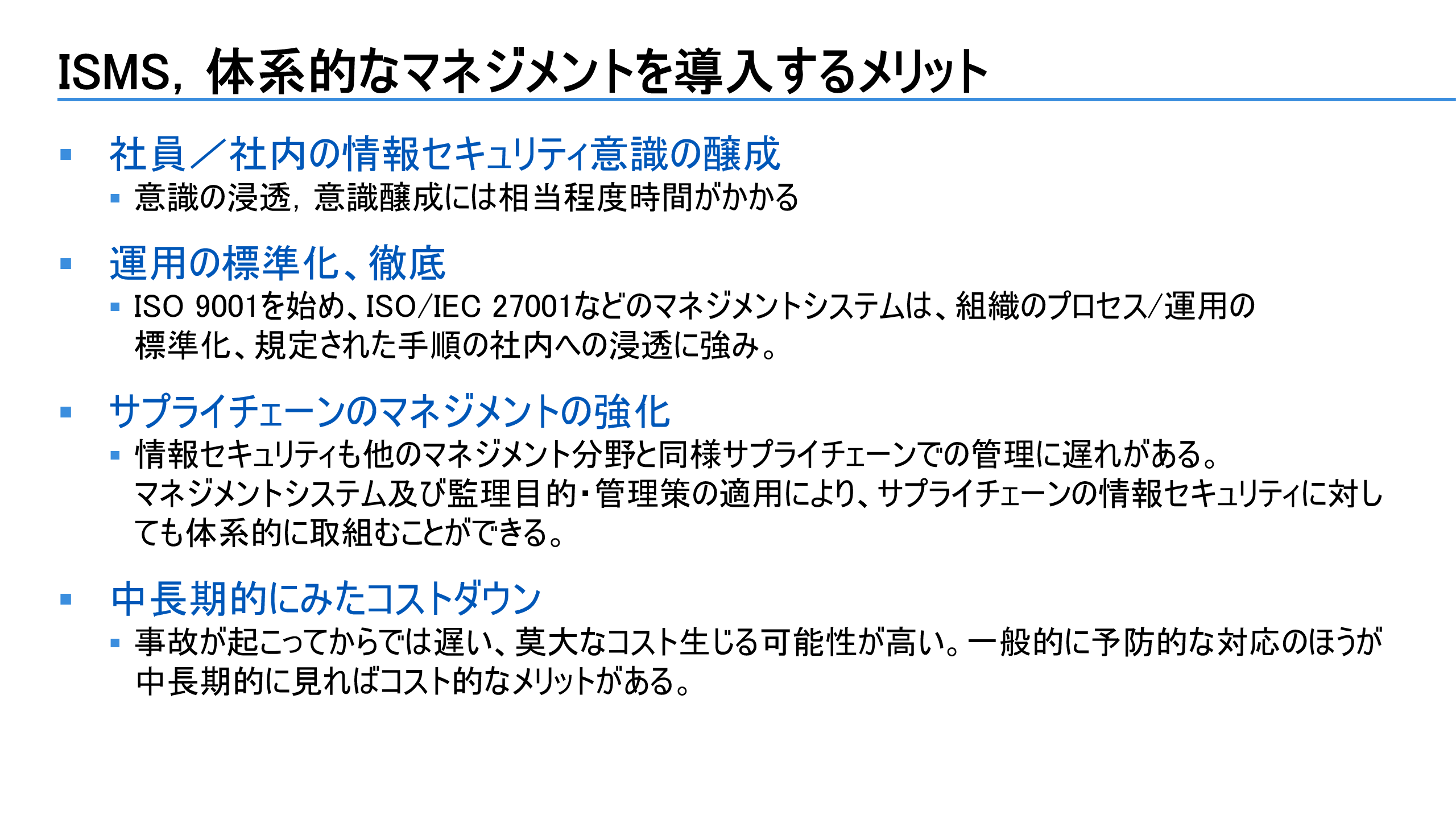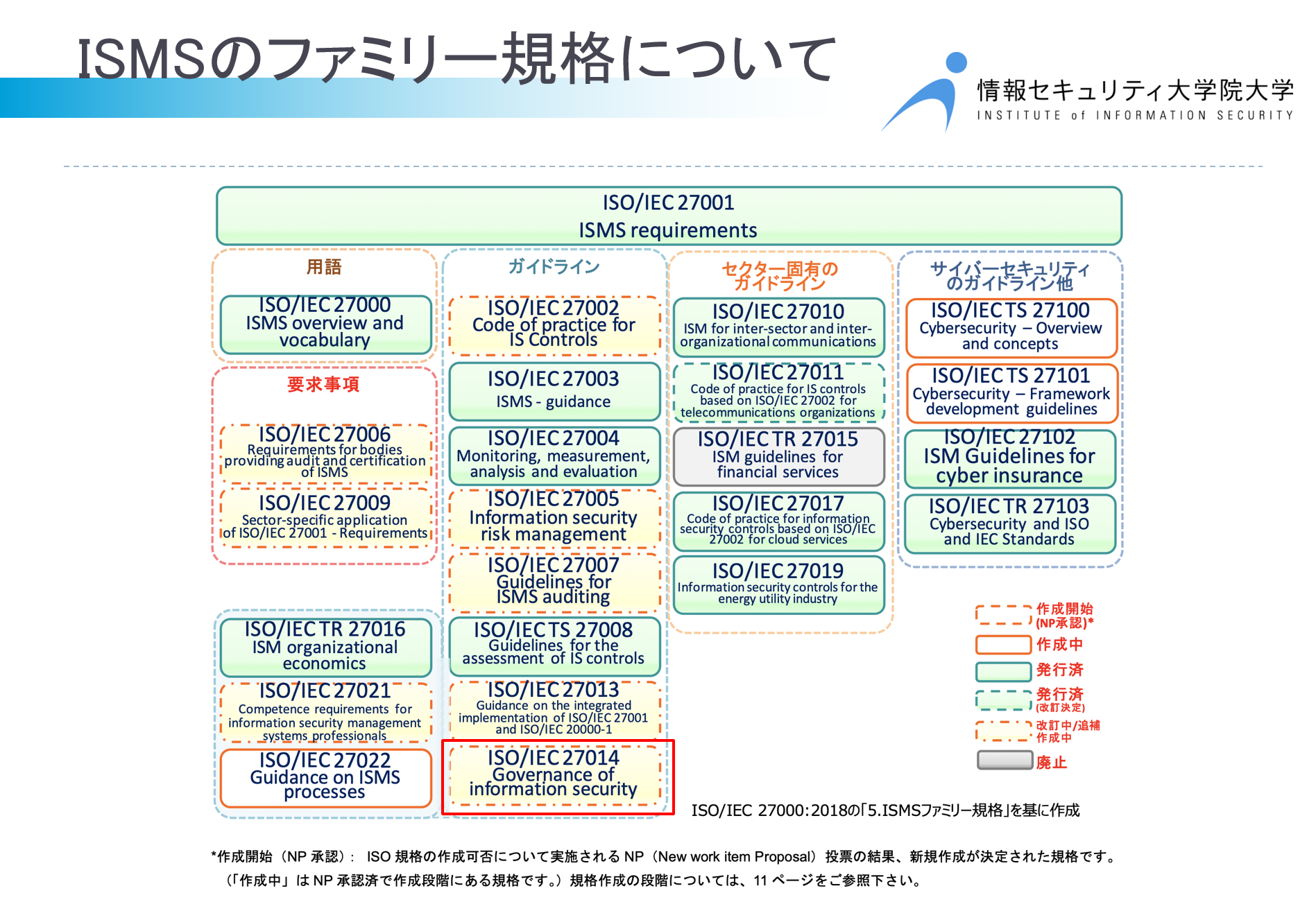 なお、情報セキュリティガバナンスISO 27014は、日本からのインプットをベースとした2013年に発効された国際標準規格で、情報セキュリティの状況に関する経営陣の見通しや、リスクに関する外部への開示のための規格です。