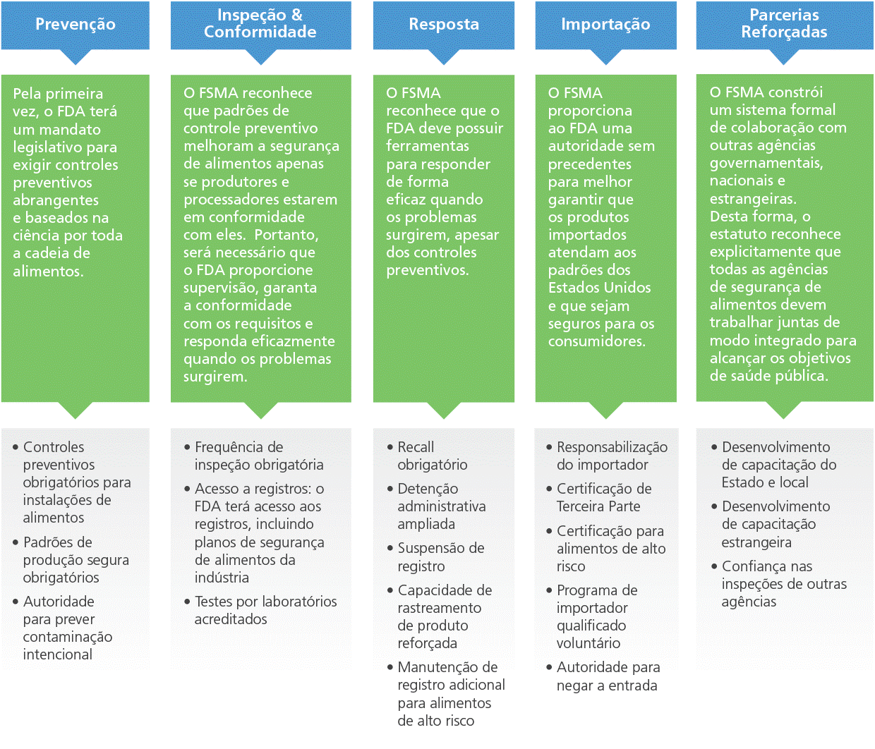 Esta lei busca garantir que o fornecimento de alimentos nos Estados Unidos seja seguro ao mudar o foco das autoridades reguladoras federais da posição reativa de resposta à contaminação para uma posição de prevenção da mesma. O FSMA do FDA inclui, por exemplo, controles preventivos para a Alimentação Humana e Animal; contém requerimentos específicos para os Fornecedores de Alimentos e Importadores Estrangeiros e identificação de Indivíduos Qualificados em Controles Preventivos.
